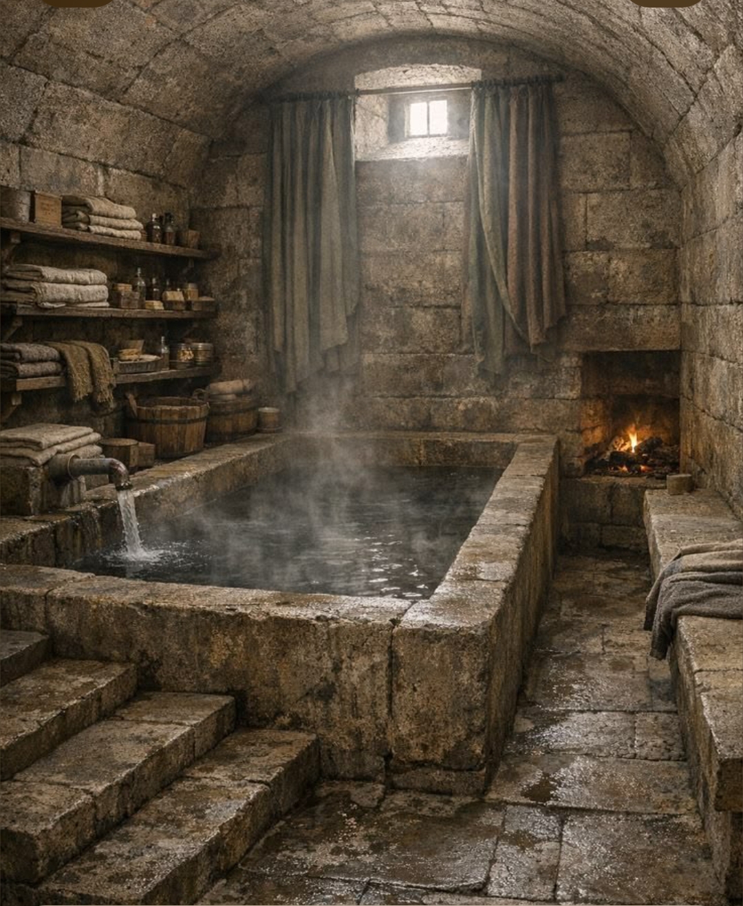 Но оказалось, что ничего запоминать не пришлось. Потому что ближайшая же дверь вела в совершенно чудесное помещение. Из маленького окна струился свет и очаг сейчас был холодным, а золу из него старательно выгребли. Но ванна была...да целый бассейн! На полках лежала одежда и все остальное, что могло понадобится. Воды внутри не было, разве что капли падали из трубы.
